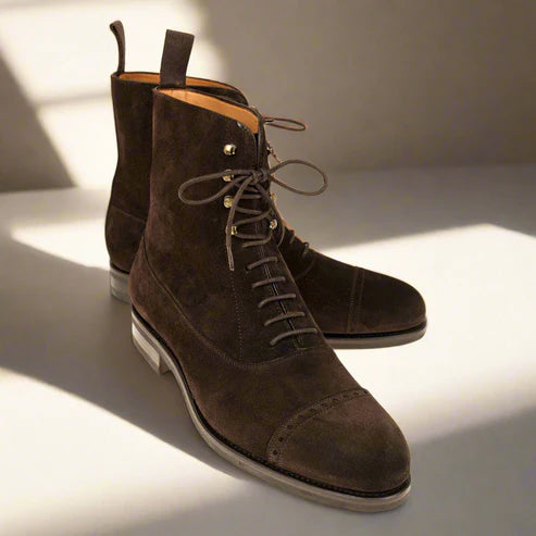 Experience unparalleled elegance with our Cavan Brown Suede Lace Up Boot, a hand-made masterpiece crafted from premium Italian leather. This sophisticated accessory blends timeless style with the latest trends, ensuring a refined look for any formal occasion. Meticulously designed by skilled artisans, it reflects luxury and durability, making it an essential addition to the modern wardrobe. Elevate your fashion statement with a product that embodies expert craftsmanship and contemporary flair.